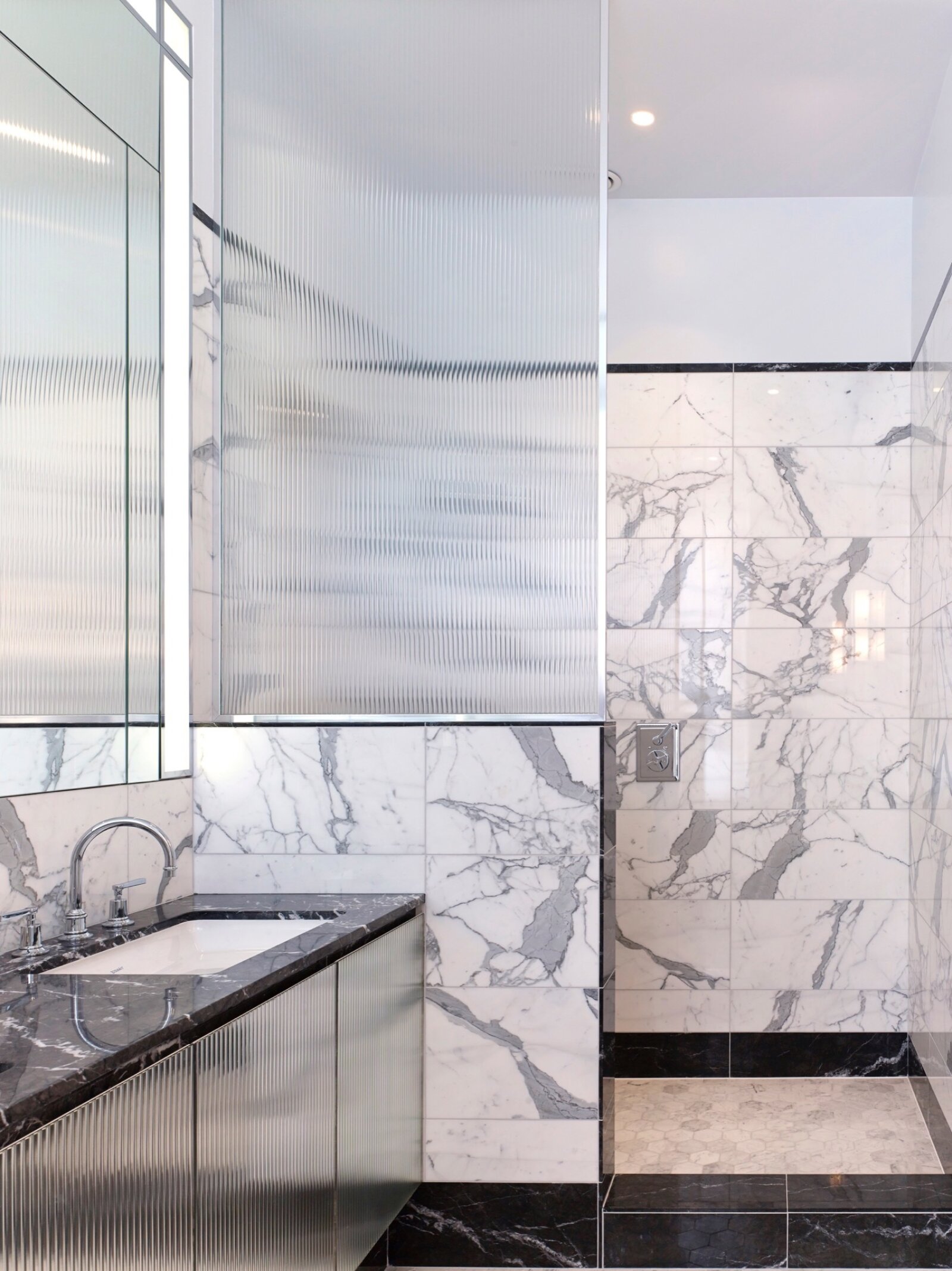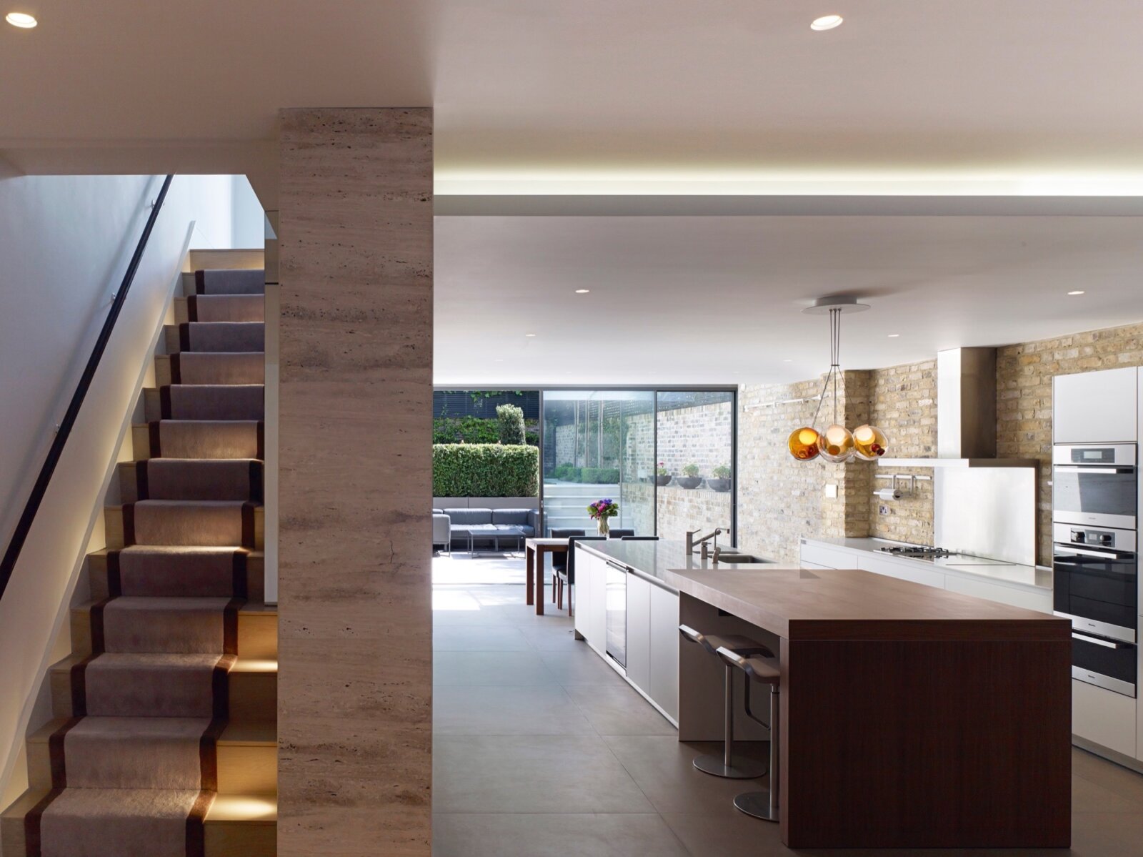 Situated just off High St Kensington, the brief for this house was to provide a rich balance of materiality between old and new, whilst providing practical living spaces for a young growing family. The lower levels have a crisp and contemporary feel with the use of large format travertine slabs and expansive glazing creating a strong connection with external spaces. A more luxurious feel occupies the upper bedroom floors with the master suite utilising contrasting marbles and high gloss lacquer finishes to create and opulent Art Deco inspired interior.
